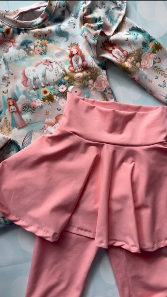 Μπλουζάκι με βολανάκι στα μανίκια γεμάτο μαγεία και μονόκερους και σάπιο μήλο κολάν με ενσωματωμένο φουστάκι για περισσότερη τσαχπινιά και νάζι.