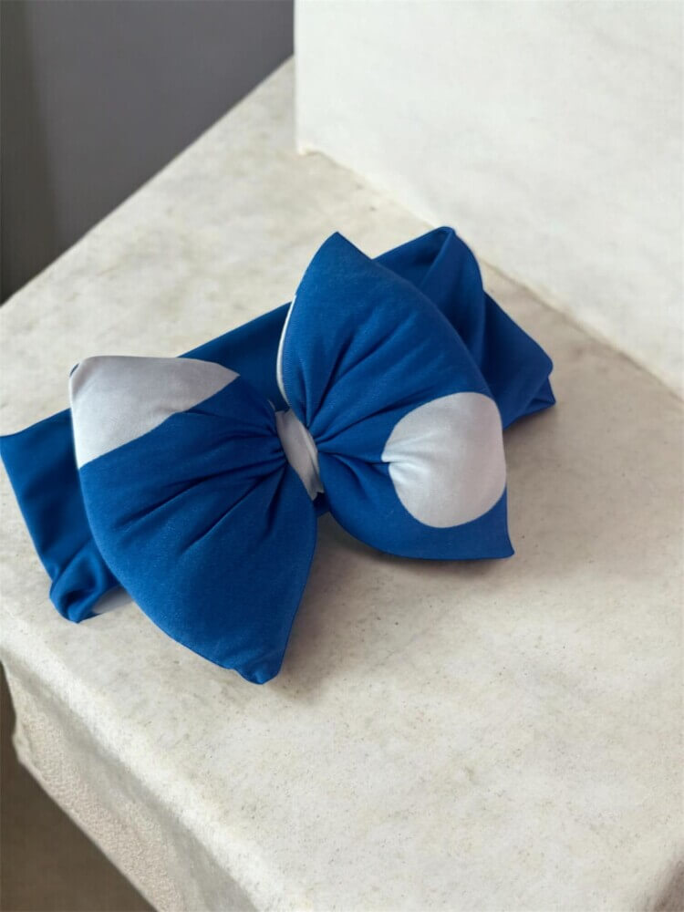 Χειροποίητη κορδέλα μπλε ρουά με λευκό πουά print σε βαμβακολύκρα ύφασμα.