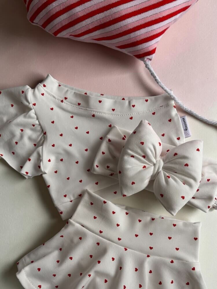 Χειροποίητο βαμβακερό σετ με εκρού βάση και κόκκινες καρδούλες.